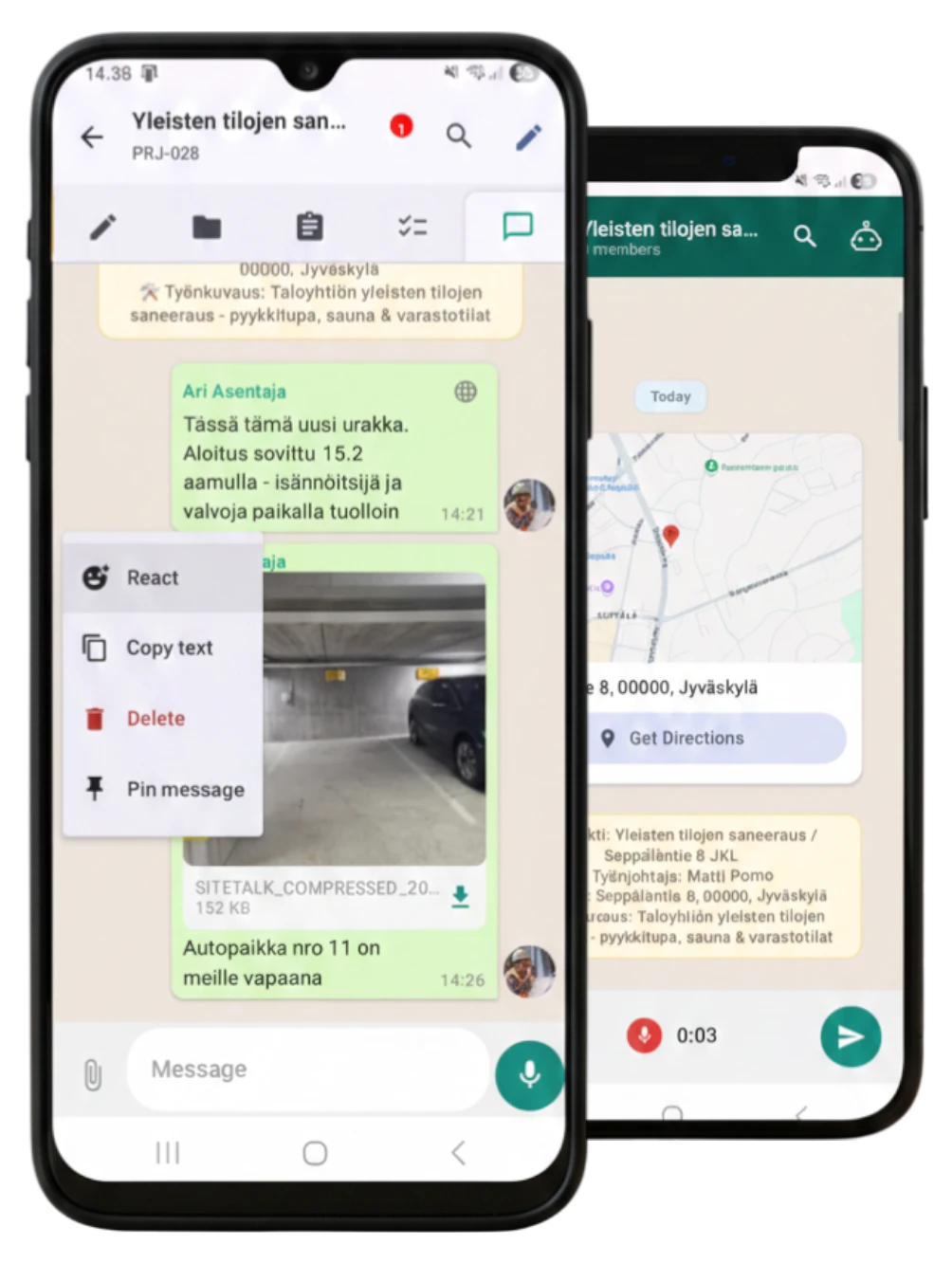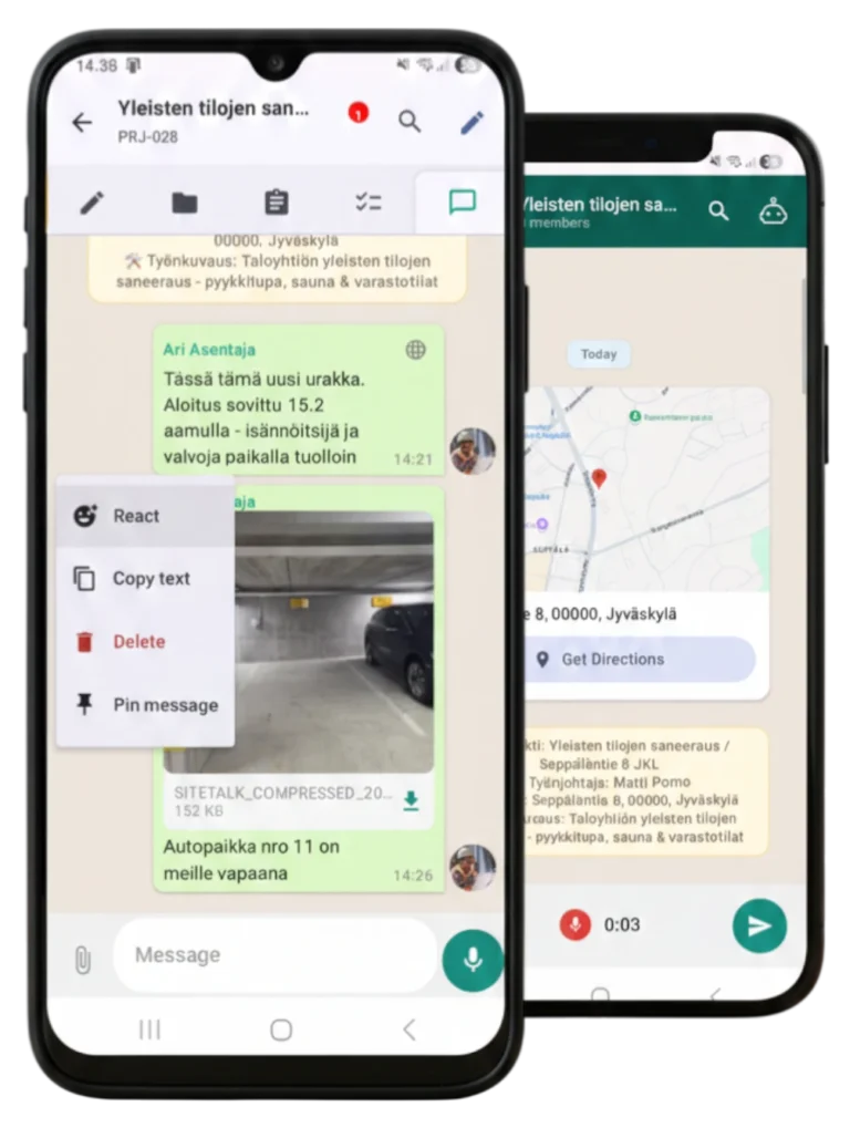 SiteTalk toimii puhelinsovelluksena Android- ja iOS-laitteilla sekä suoraan selaimessa, missä ja milloin tahansa.