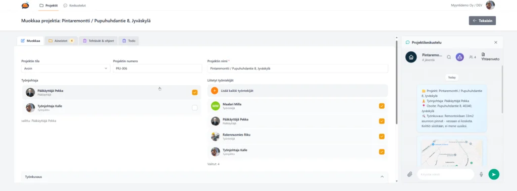 Samalla huomasimme toistuvan haasteen. ERP-järjestelmät ovat erinomaisia suurten kokonaisuuksien hallinnassa, mutta työmaan nopeatempoinen arki jää usein niiden ulkopuolelle. Päivittäinen viestintä työnjohdon ja tekijöiden välillä ei taivu raskaisiin prosesseihin. Siksi viestintä päätyy helposti kuluttajasovelluksiin, mikä tuo mukanaan riskejä tiedon hallintaan ja tietoturvaan.