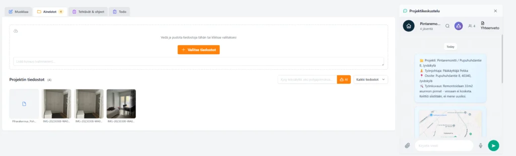 Viestit ja dokumentit ovat projektikohtaisesti ja kaikki tieto löytyy helposti |